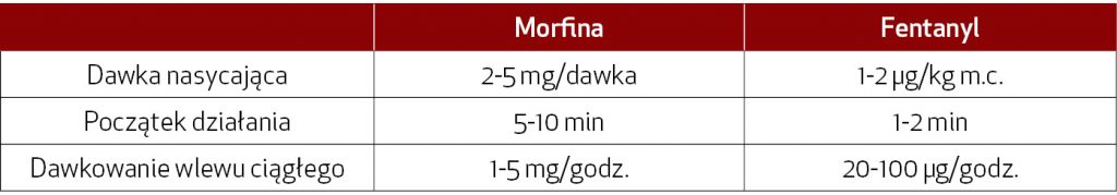 Skala ta może także zostać pośrednio przeniesiona na ocenę sedacji. Opioidy są najczęściej stosowanymi lekami do zmniejszenia bólu u chorych poddanych intensywnej terapii i powodują również umiarkowaną sedację, ale w przeciwieństwie do benzodiazepin nie powodują niepamięci. Podczas terapii stosowane są zazwyczaj morfina i fentanyl. Ciągła infuzja jest metodą bardziej polecaną niż podawanie opioidów „w razie potrzeby”. Zaletami fentanylu, dającymi mu przewagę nad morfiną, są: znacznie szybszy początek działania, mniejsze ryzyko hipotensji oraz brak aktywnych metabolitów. Względny brak niekorzystnego działania hemodynamicznego jest głównym powodem, dla którego fentanyl jest lepszym wyborem dla pacjenta w stanie krytycznym. Morfina ma wiele aktywnych metabolitów o niekorzystnym działaniu, powoduje także uwalnianie histaminy, co w konsekwencji może doprowadzić do hipotensji. W tab. 5 przedstawiono charakterystykę i dawkowanie morfiny i fentanylu we wlewie ciągłym.